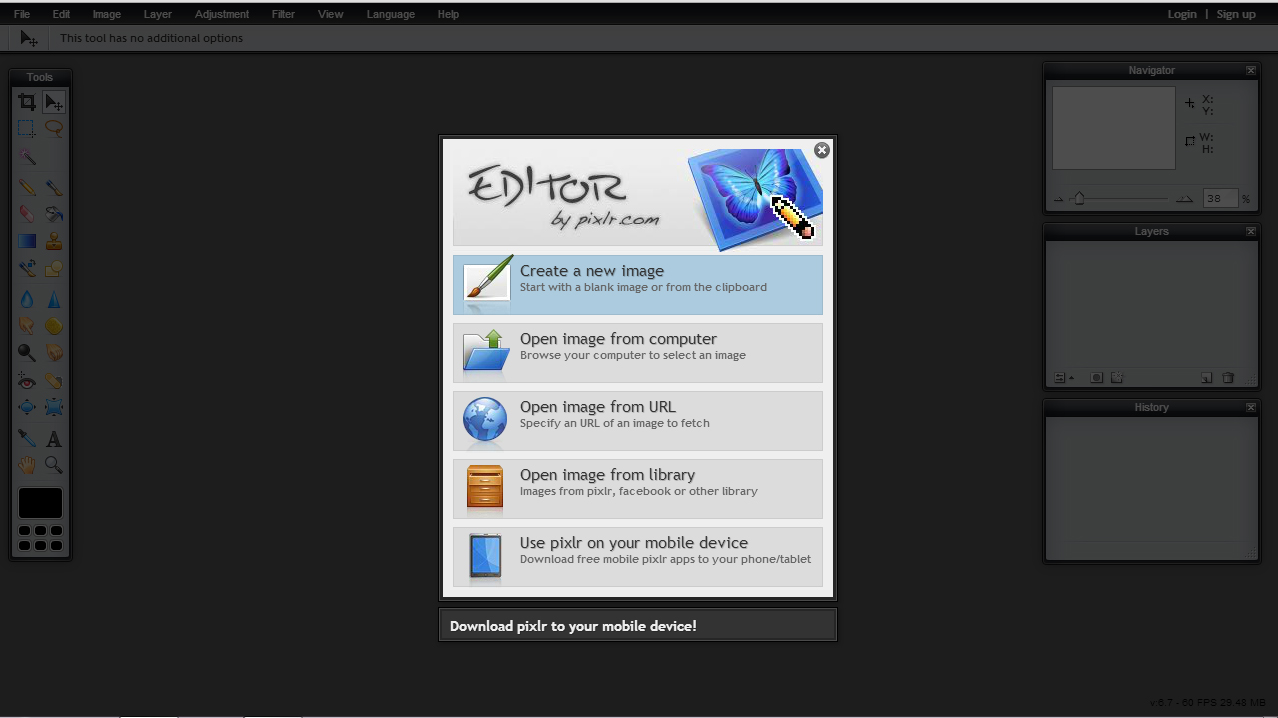 Rendez-vous tout d’abord à l’adresse suivante, chez pixlr.com, un éditeur de photo en ligne et gratuit. Rien à télécharger et très intuitif, voici comment procéder :