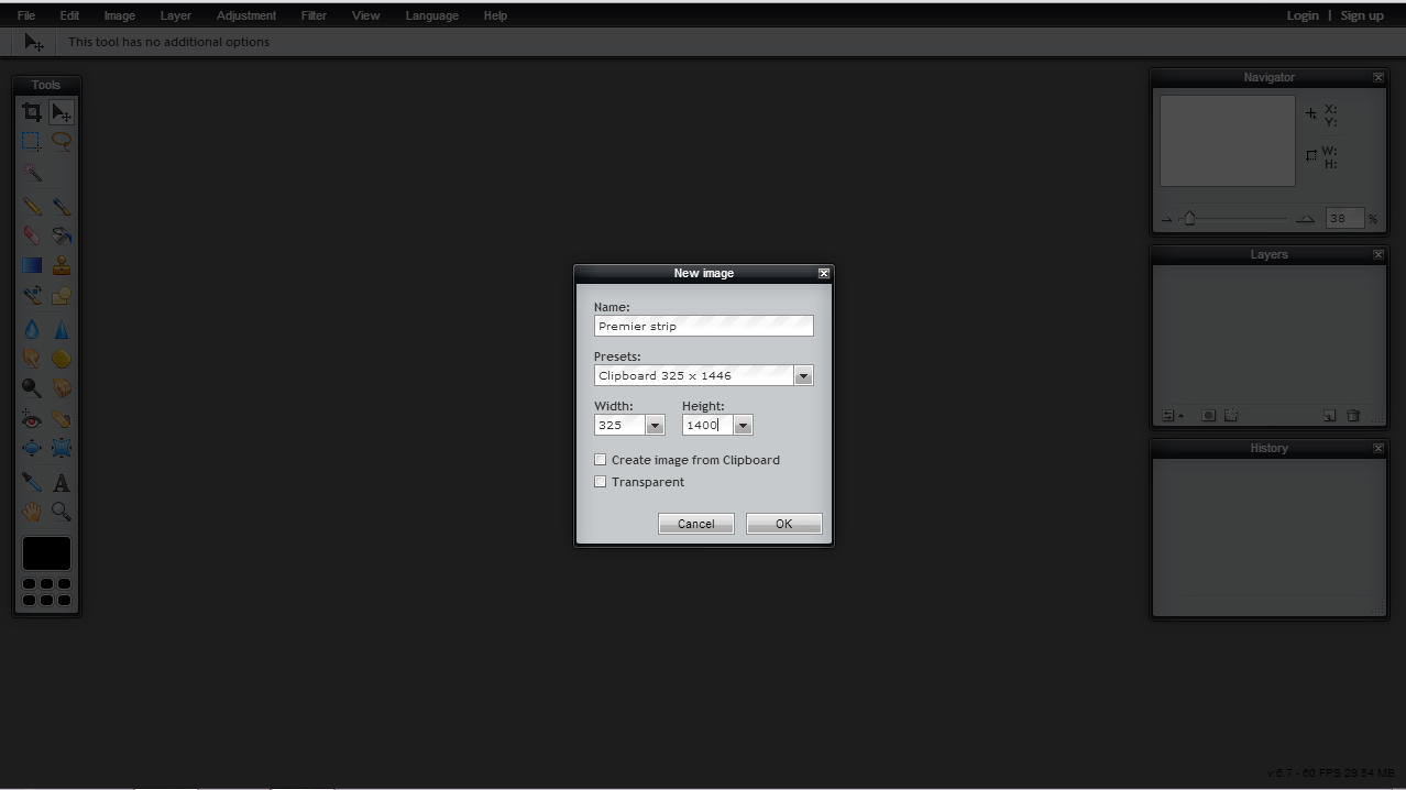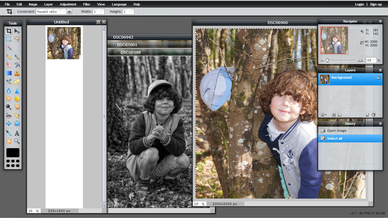 Après avoir cliqué sur Pixlr Editor, choisissez ” Create a new image “ (dimensions 325x1400px).Il vous suffit ensuite d’importer vos photos, si elles sont uniquement sur Instagram, vous pouvez ouvrir un nouvel onglet et aller à cette adresse. Loguez vous avec votre pseudo et votre mot de passe Instagram. Vous verrez vos photos, faites “clique droit” sur celle de votre choix “copier” puis retournez sur Pixlr et faites ctrl+v (coller). Faites de même pour vos 4 photos :
