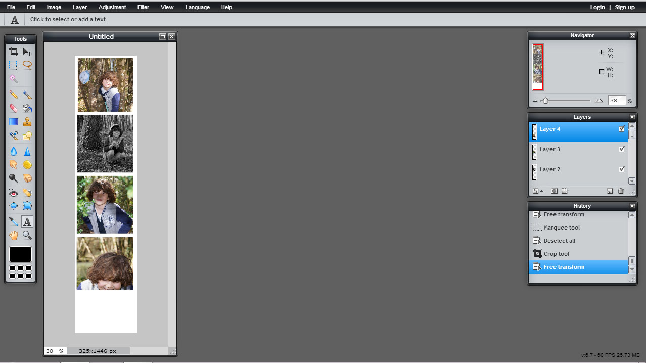 Puis collez de la même manière (cliquez sur votre photo, appuyez sur ctrl+c, cliquez sur votre image avec un fond blanc et appuyez sur ctrl+v) vos 4 photos sur votre strip. Redimensionnez-les avec Edit “free transform”. Laissez une petite marge blanche autour pour faire un joli effet “pellicule”.
