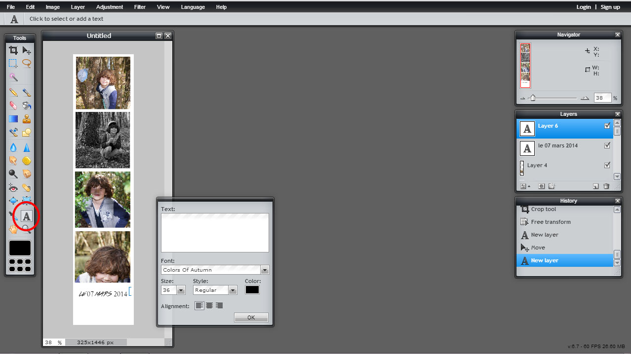 Cliquez sur le “A” à gauche pour ajouter du texte, la date, une citation ou ce que vous voulez. Vous verrez c’est très intuitif, on peut changer la police d’écriture et la taille.
