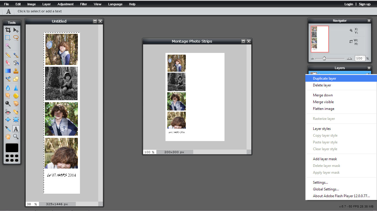 A droite positionnez vous sur le calque de votre strip et cliquez sur “duplicate layer” pour le dupliquer. Déplacez-le avec la flèche (dans les outils à gauche). Ainsi vous aurez trois fois le même strip dans une page, parfait si vous voulez en offrir à toute votre famille ou amis. Vous pouvez bien sur en mettre des différents sur la même page .